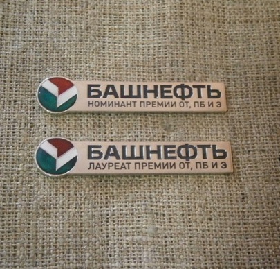 Значки со смолой "Башнефть". Два текста на значке - "Лауреат премии и номинант премии". Смолой покрыта только часть значка.
